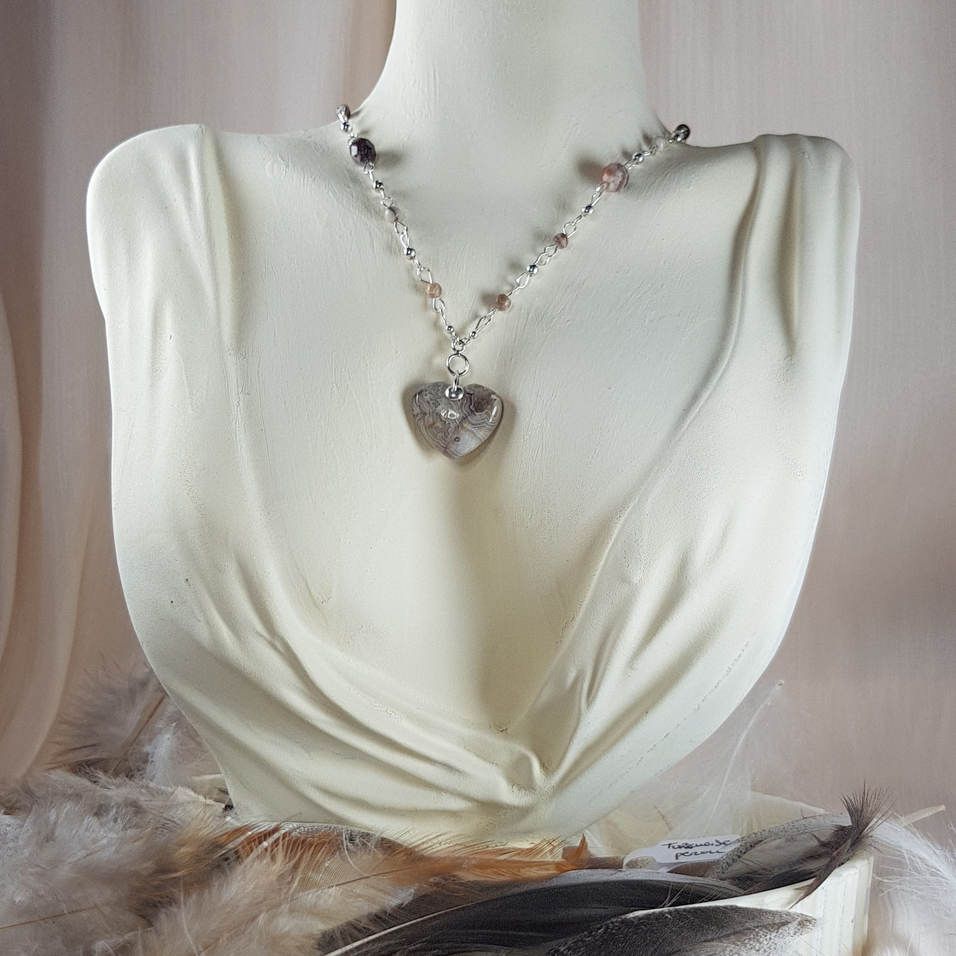 Pendentif agate mexicaine appelée aussi agate crazy en forme de coeur et chaine argent 925