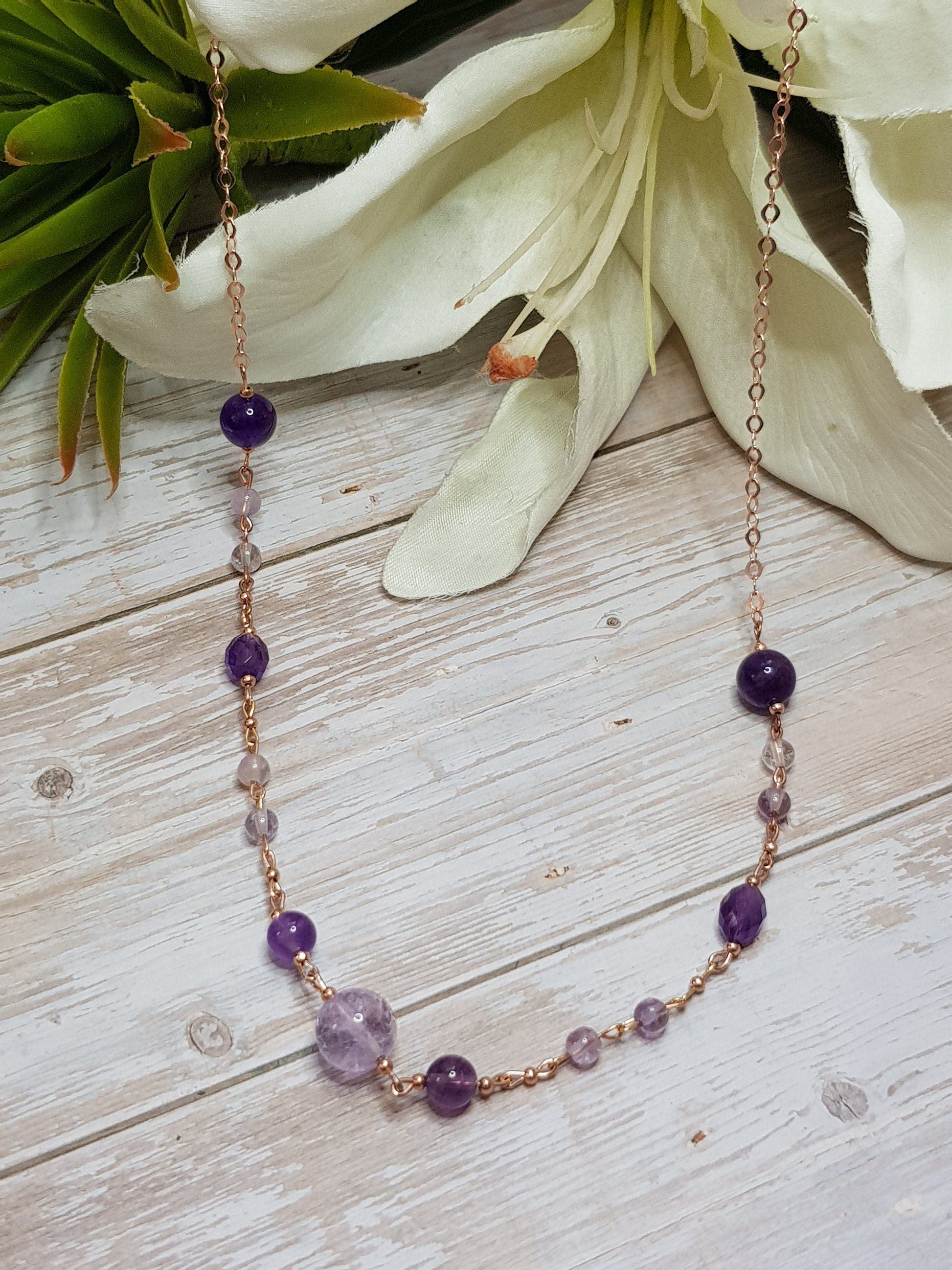 1 anneau amethyste + pierres amethyste + perles argent 925 rose + chaine argent 925 rose