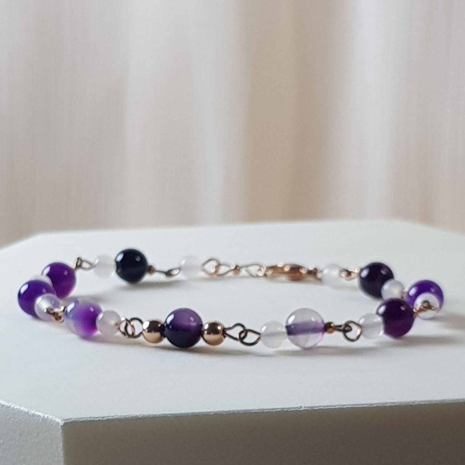 composé de pierres rondes agate violette+ agate blanche + perles argent 925 plaqué or rose