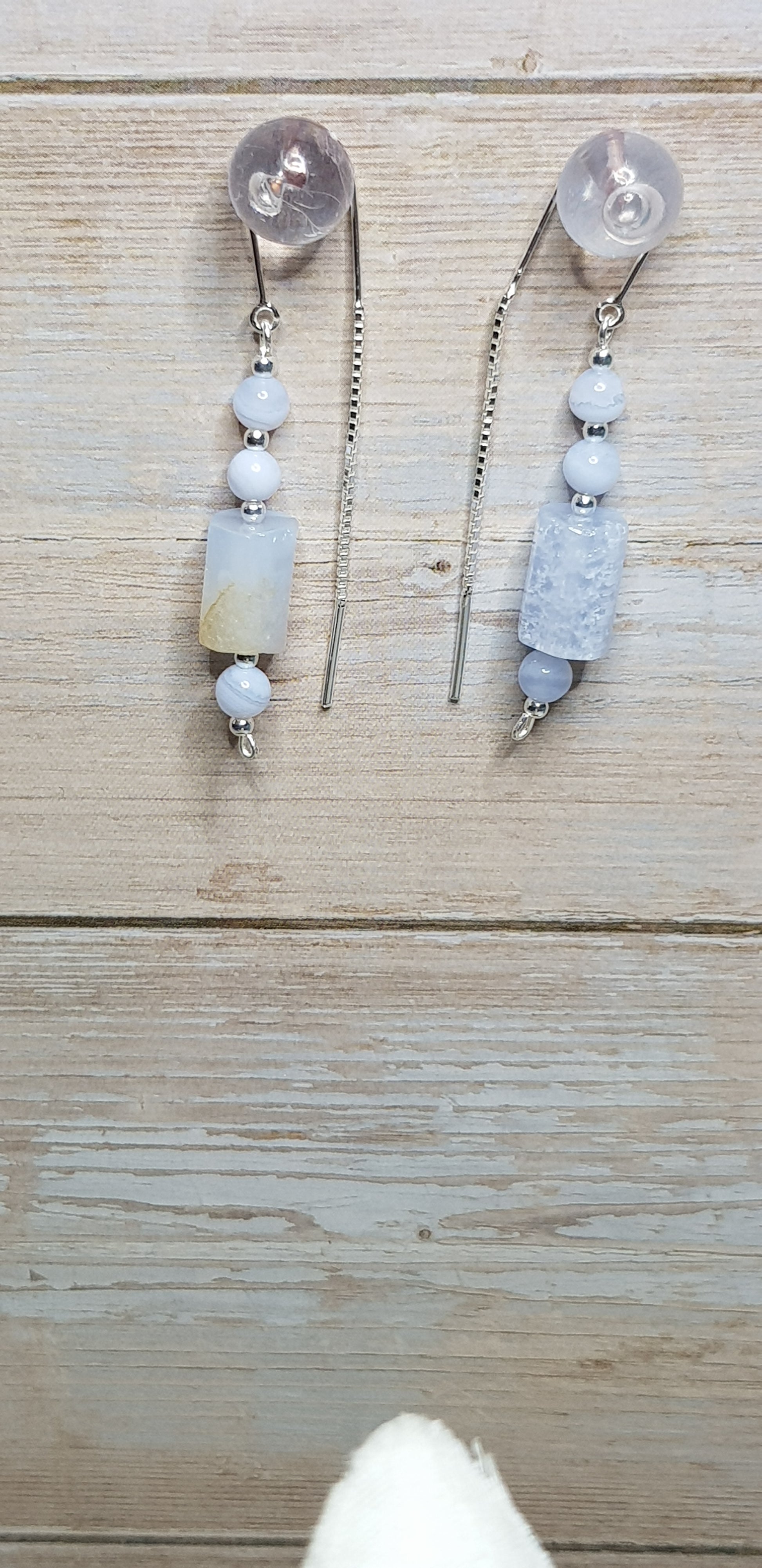Boucles oreilles avec chaine composée de perles calcédoine bleue + perles argent 925