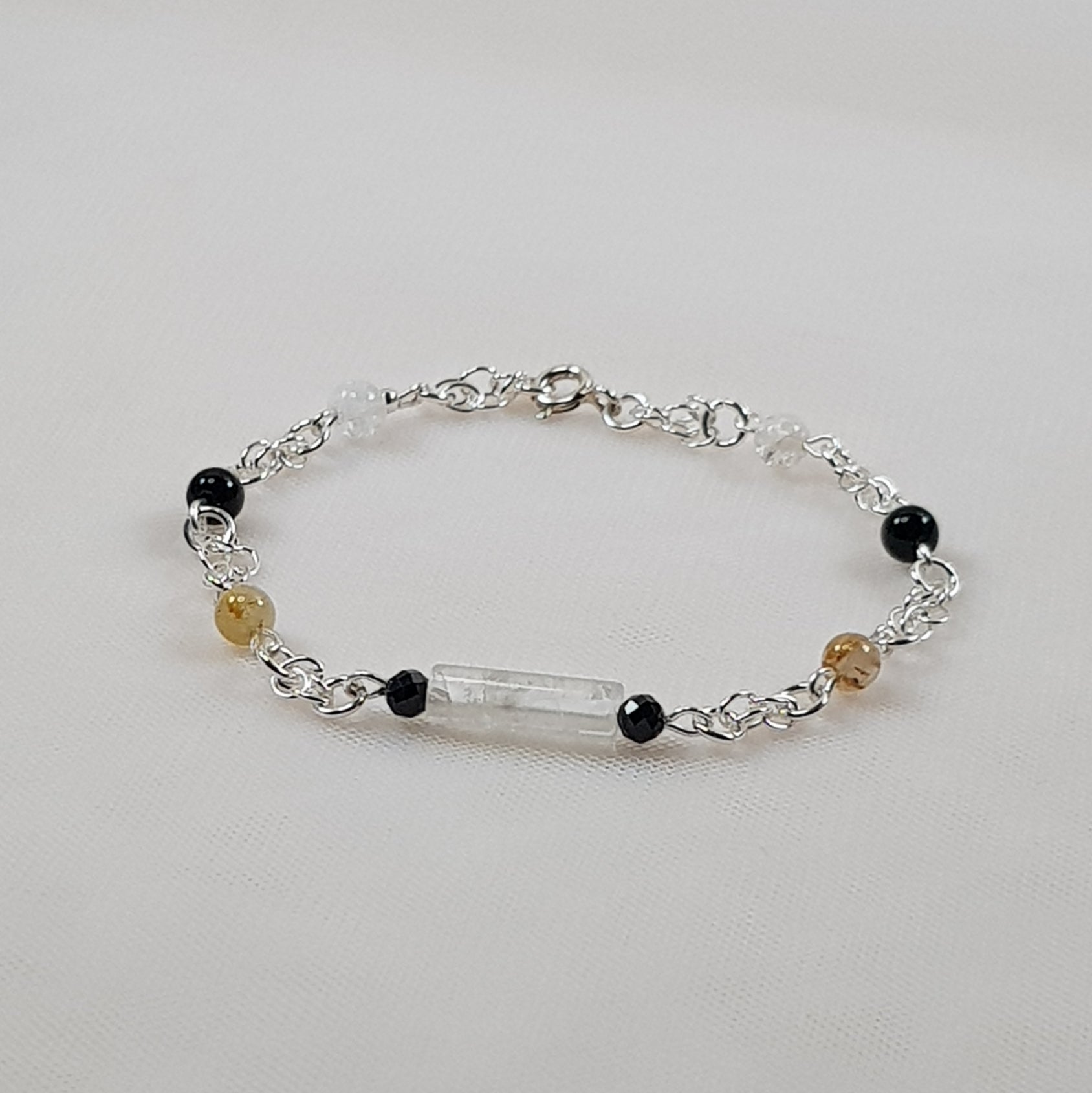 composé de pierres cristal de roche craquelé, quartz rutile, onyx + perles argent 925 + chainette argent 925
