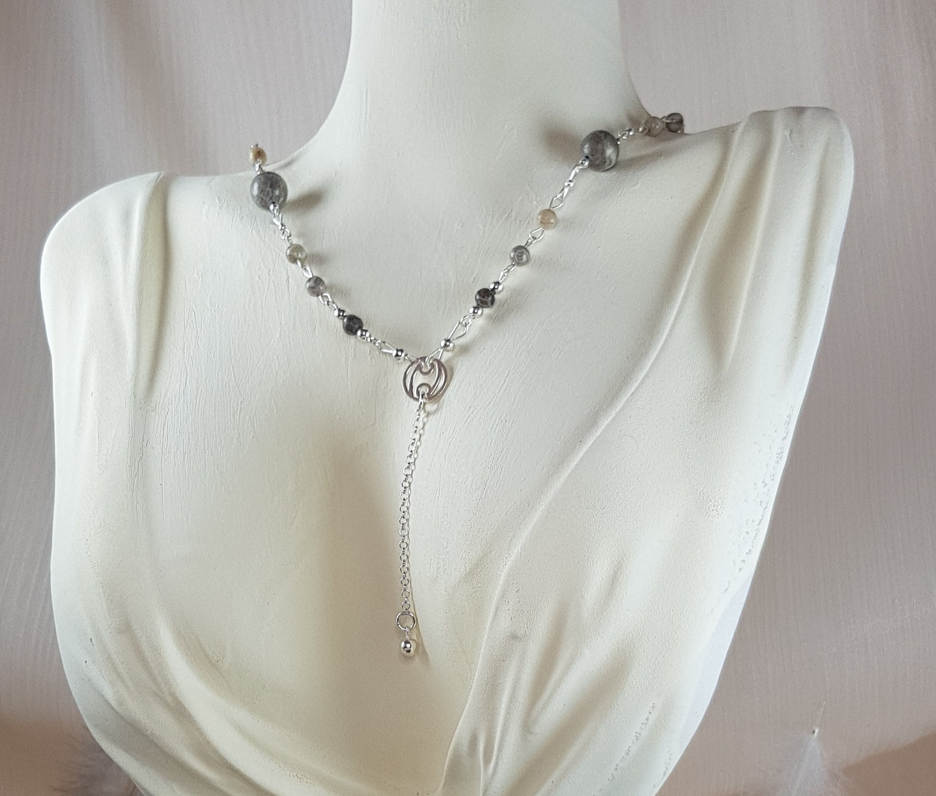 Pendentif composé de pierres corail + signe cancer argent 925 + perles argent 925 + chaine argent 925 de 45 cm