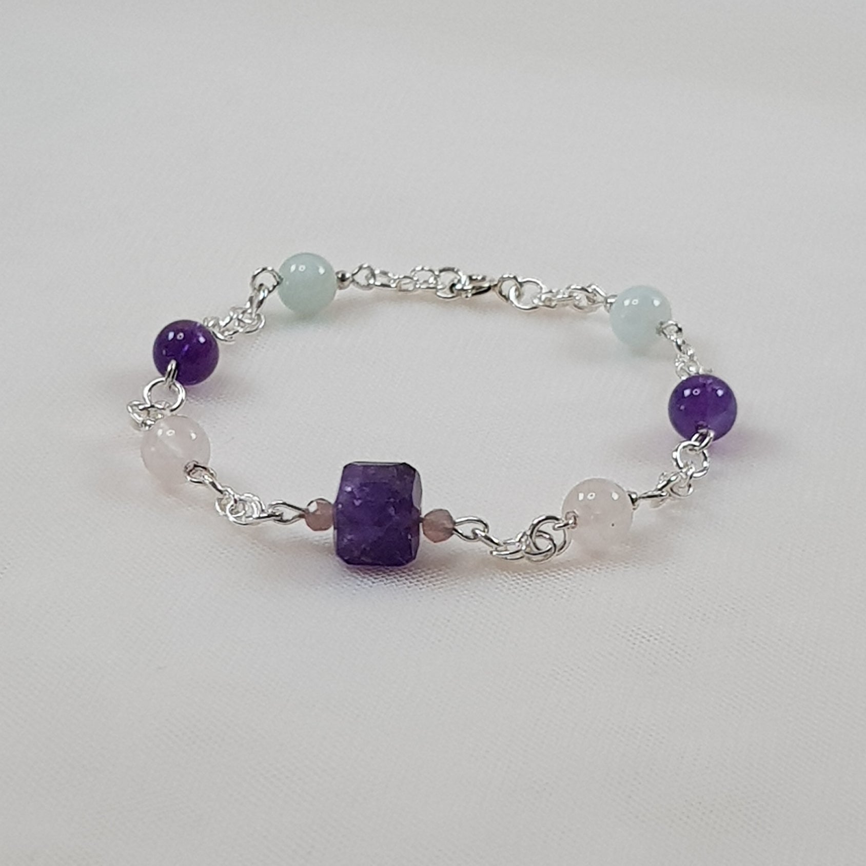 composé de quartz rose, aigue marine, améthyste + perles argent 925 + chainette argent 925