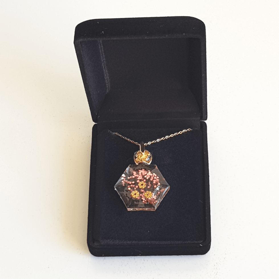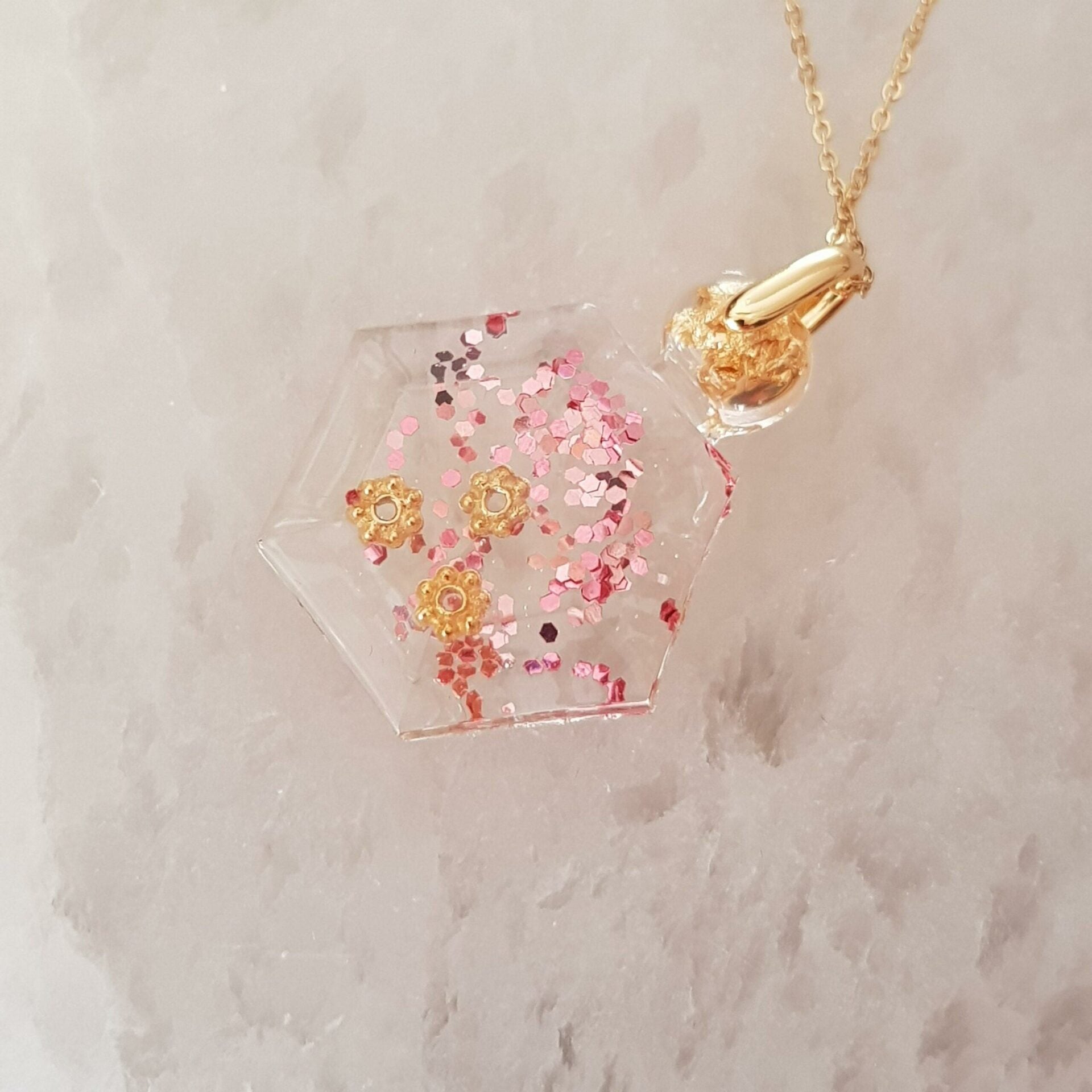 - Matériaux : résine, pigments, chaine en acier inoxydable doré appelé aussi acier chirurgical