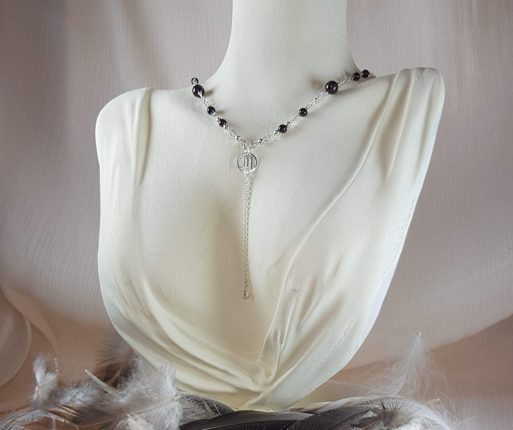 Pendentif composé de pierres grenat + signe scorpion argent 925 + perles argent 925 + chaine argent 925 de 45 cm