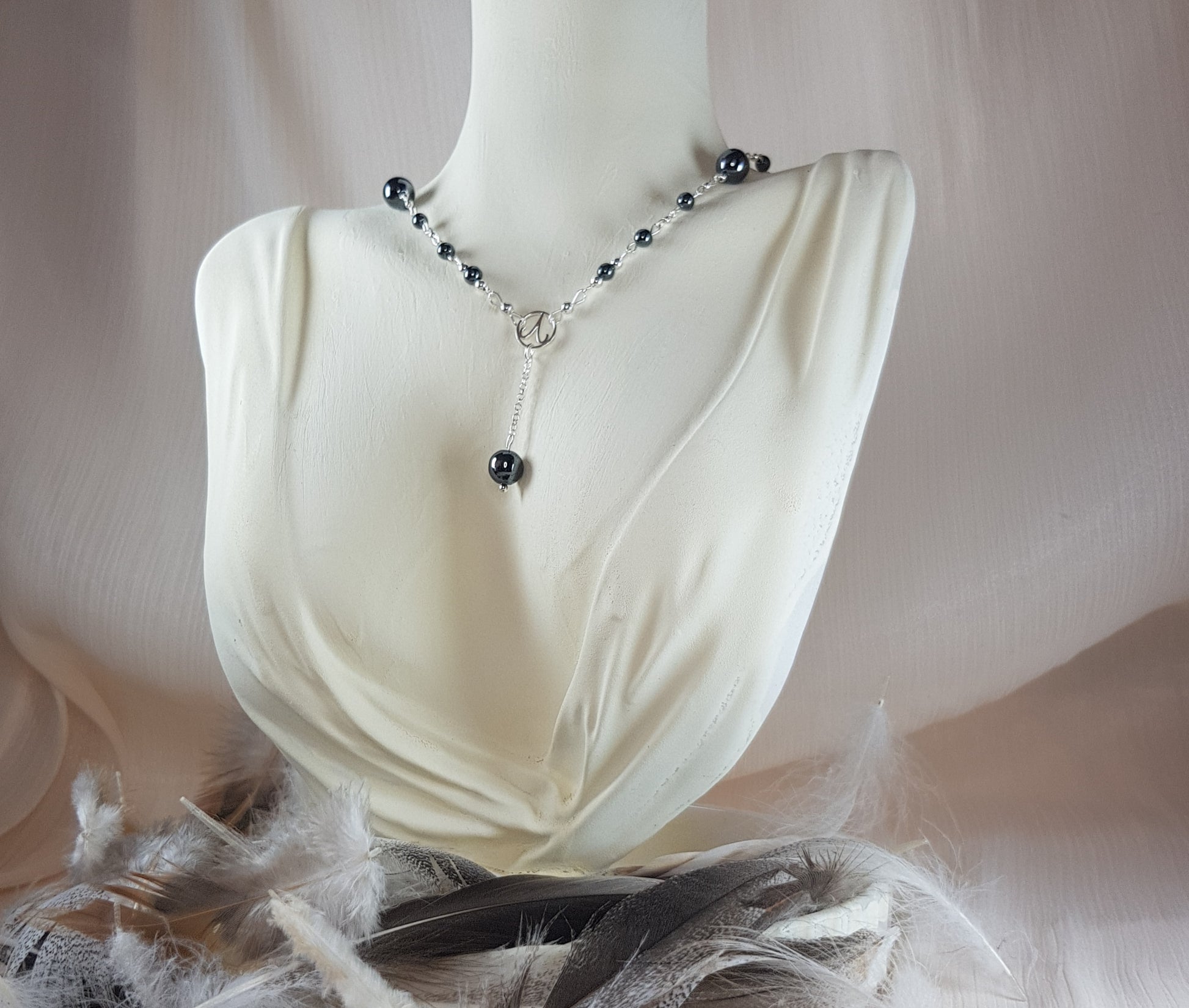 Pendentif composé de pierres hématite + signe bélier argent 925 + perles argent 925 + chaine argent 925 de 45 cm