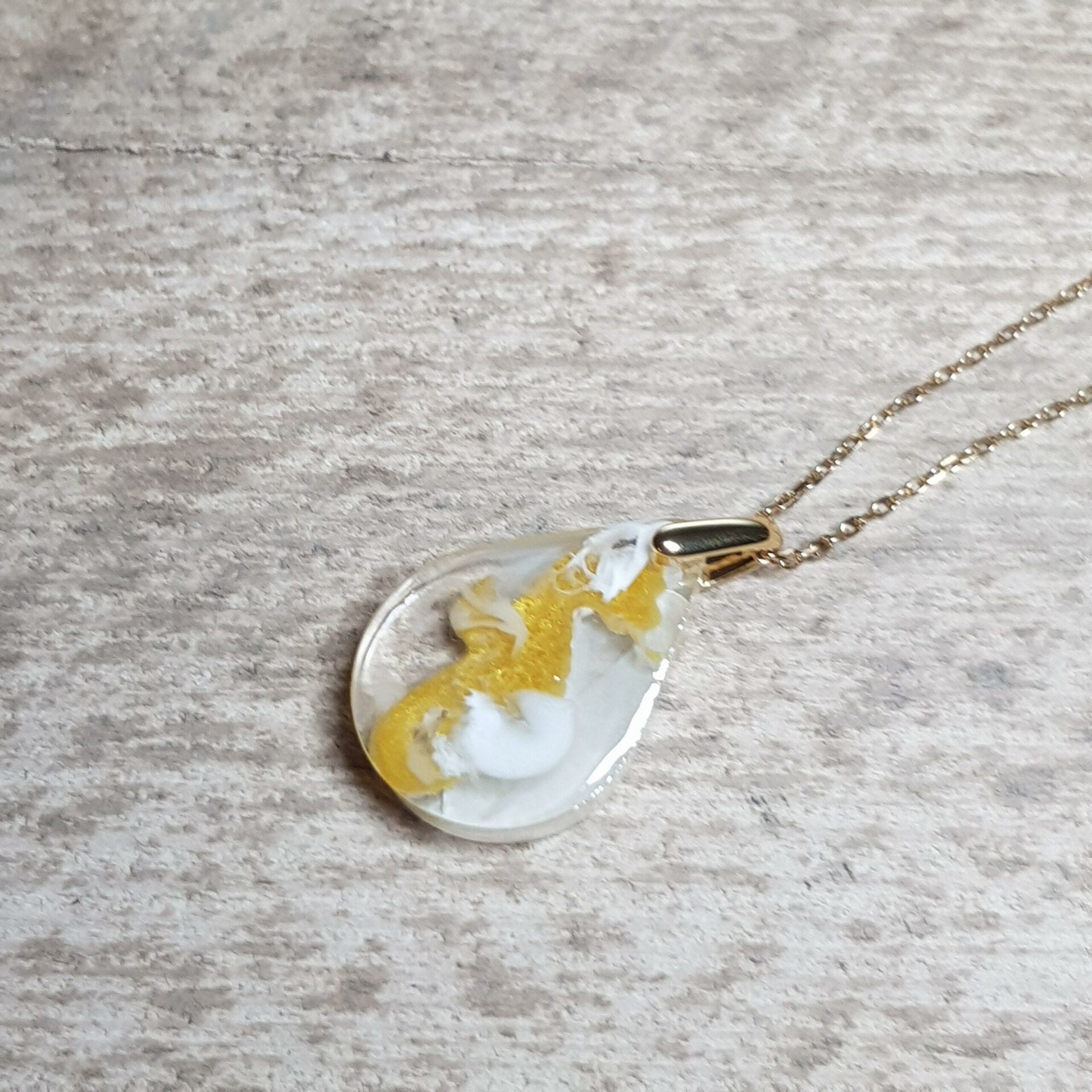 - Matériaux : résine, pigments, chaine en acier inoxydable doré appelé aussi acier chirurgical
