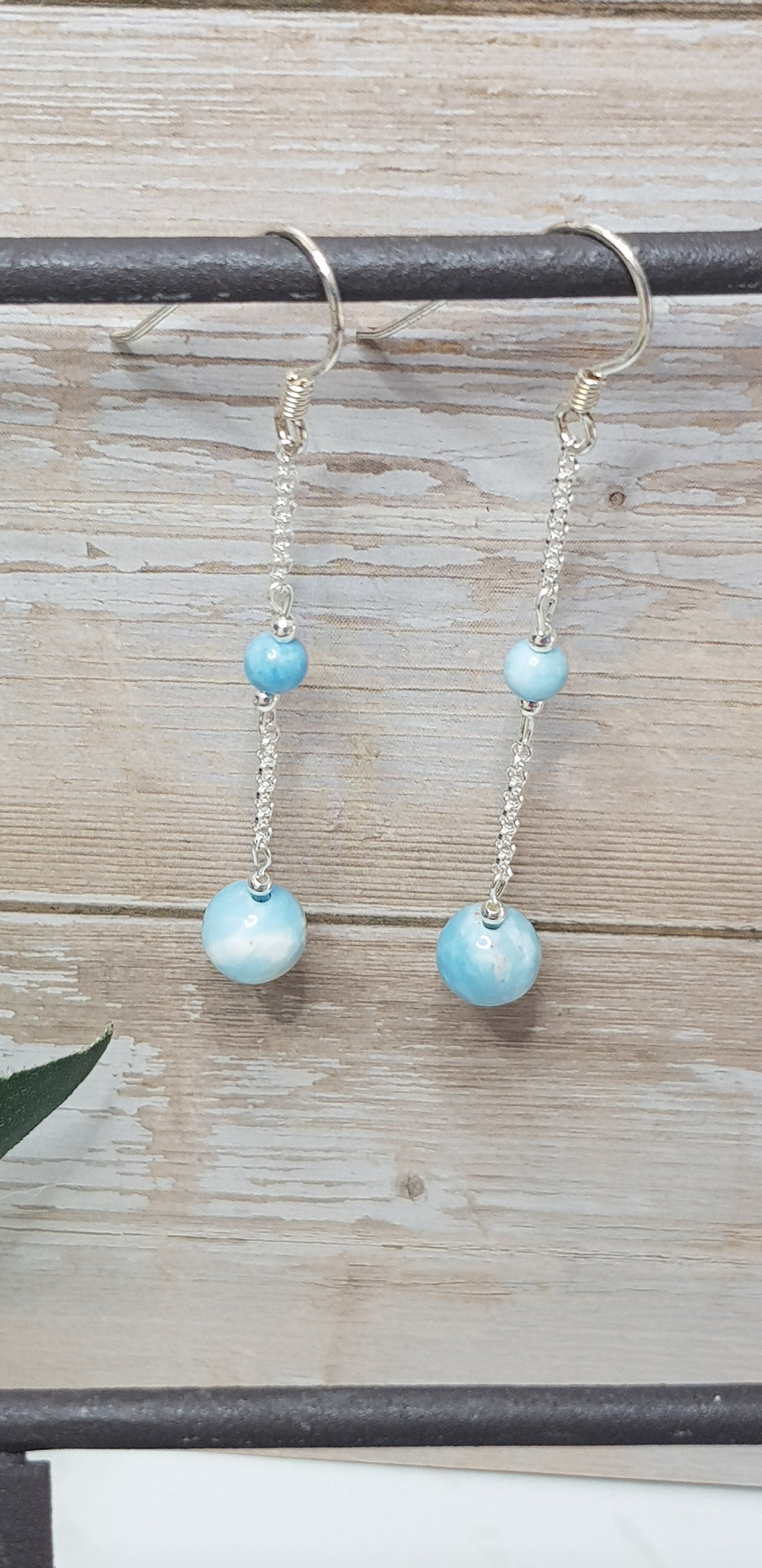 Boucles d'oreilles larimar argent 925 composées d'une perle larimar 8mm, 1 perle de larimar 4 mm, 2 crochets oreilles argent 925, 2 perles argent 925