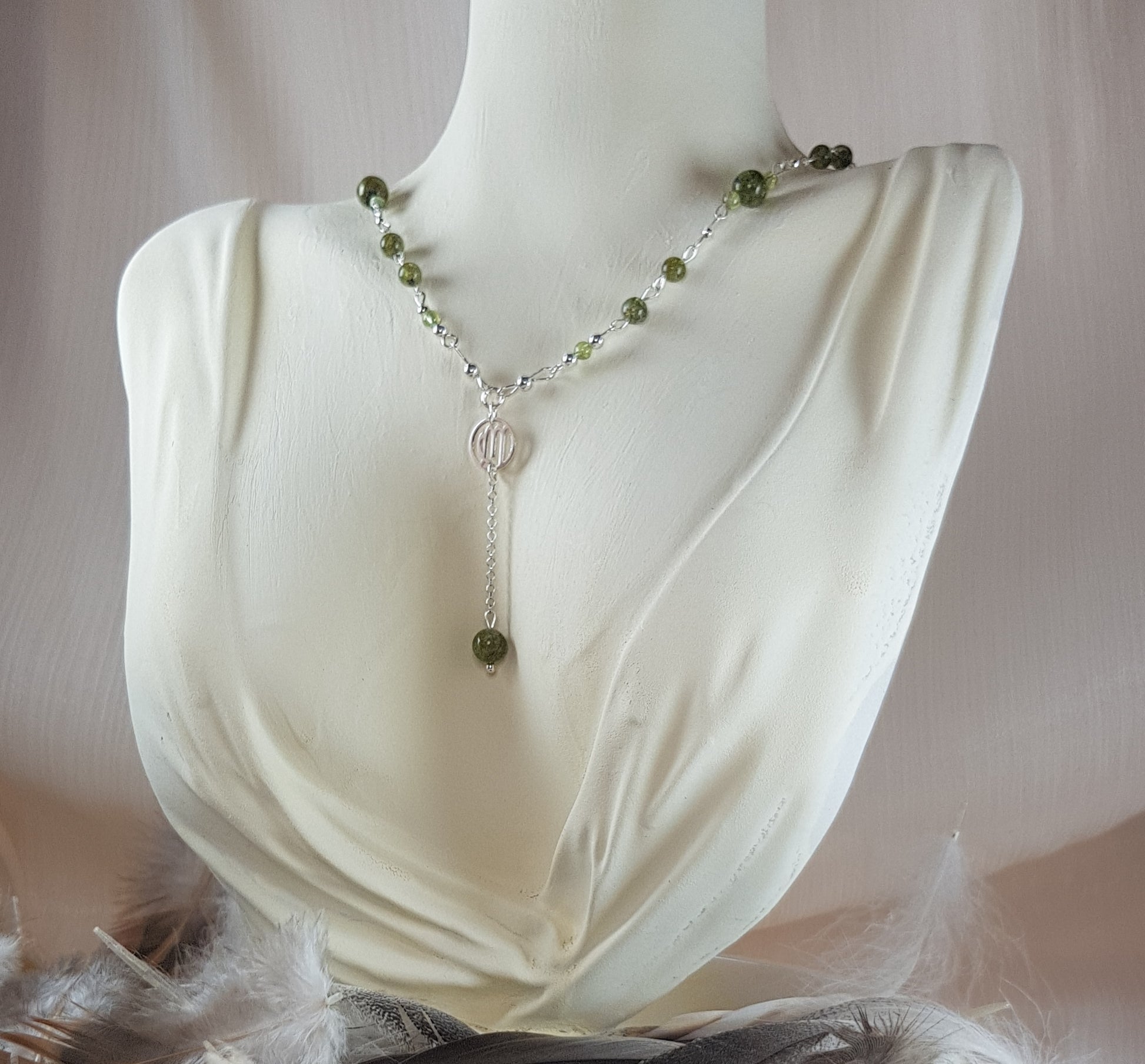 Pendentif composé de pierres péridot + signe vierge argent 925 + perles argent 925 + chaine argent 925 de 45 cm