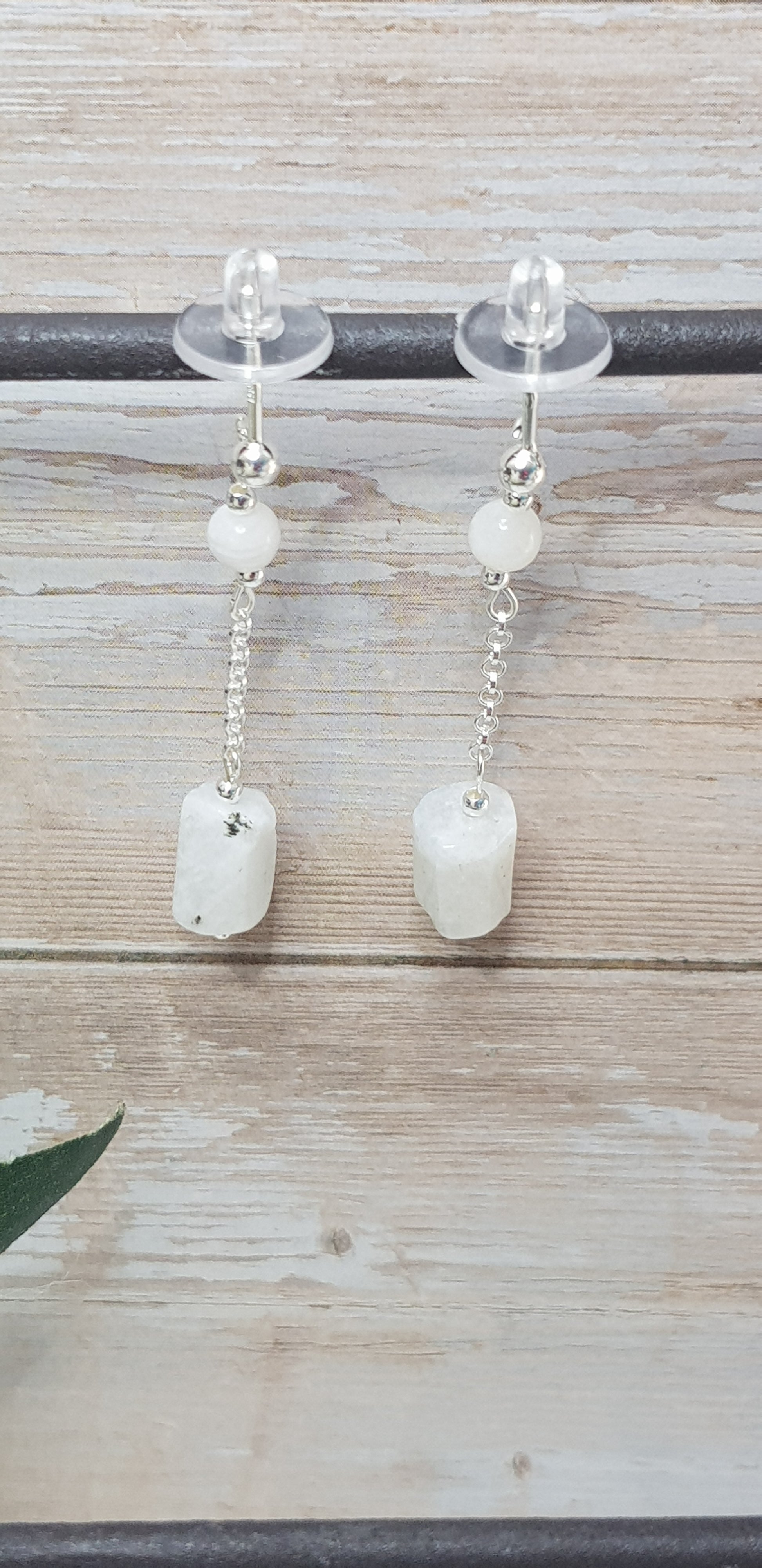 Boucles d'oreilles pierre de lune blanche argent 925 composées d'une perle pierre de lune 8 mm, 2 crochets oreilles argent 925, 2 perles argent 925, 1bijou aile d’ange argent 925