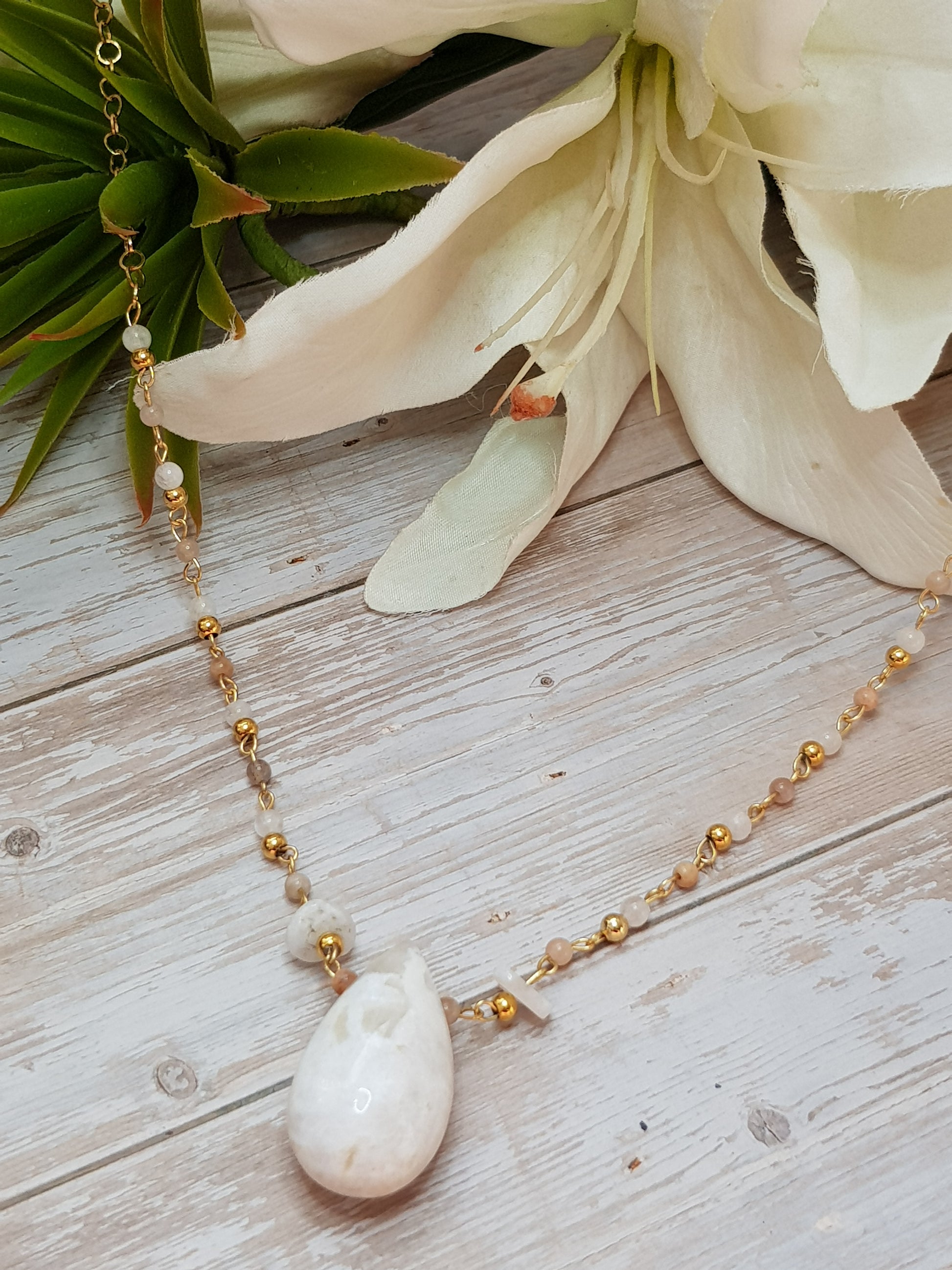 pierre de lune + perles acier+ chaine acier