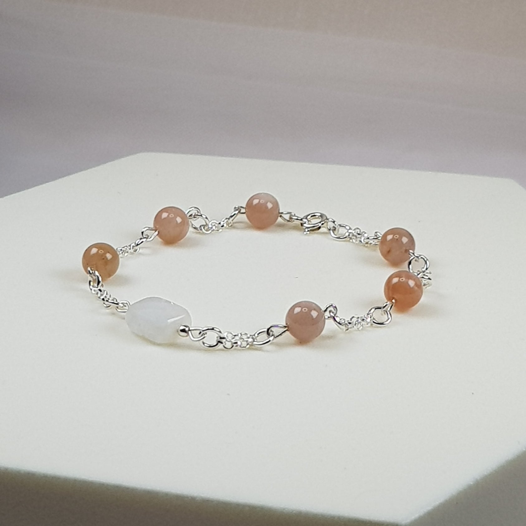 Bracelet pierre de lune pêche + blanche + argent 925 + chainette argent 925