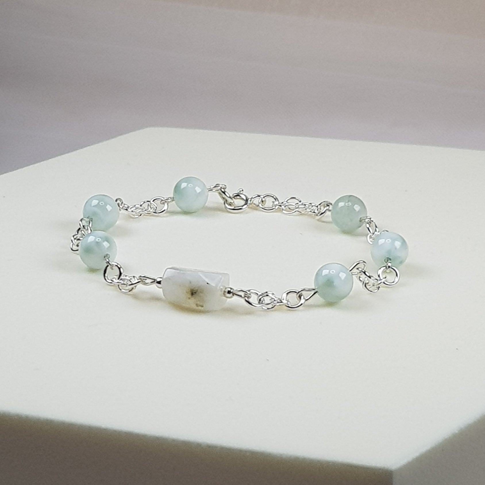 Bracelet pierre de lune verte + blanche + argent 925 + chainette argent 925