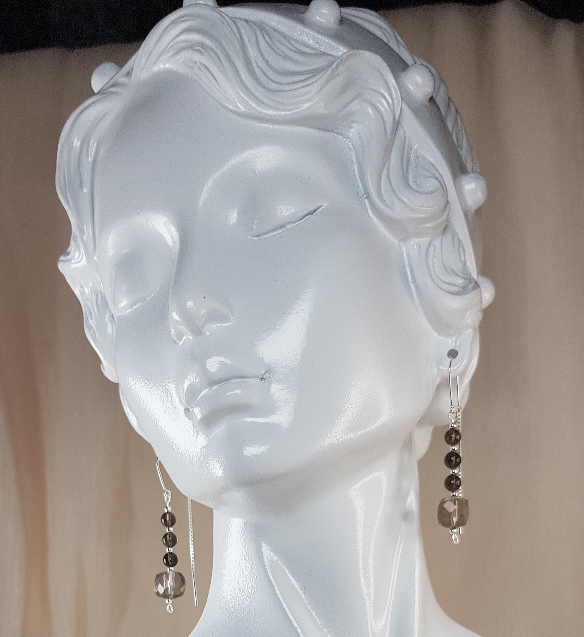 Boucles d'oreilles quartz fumé argent 925 composées d'une perle quartz fumé cube 10 mm, 2 crochets oreilles argent 925, 2 perles argent 925, 3 perles quartz fumé 4 mm