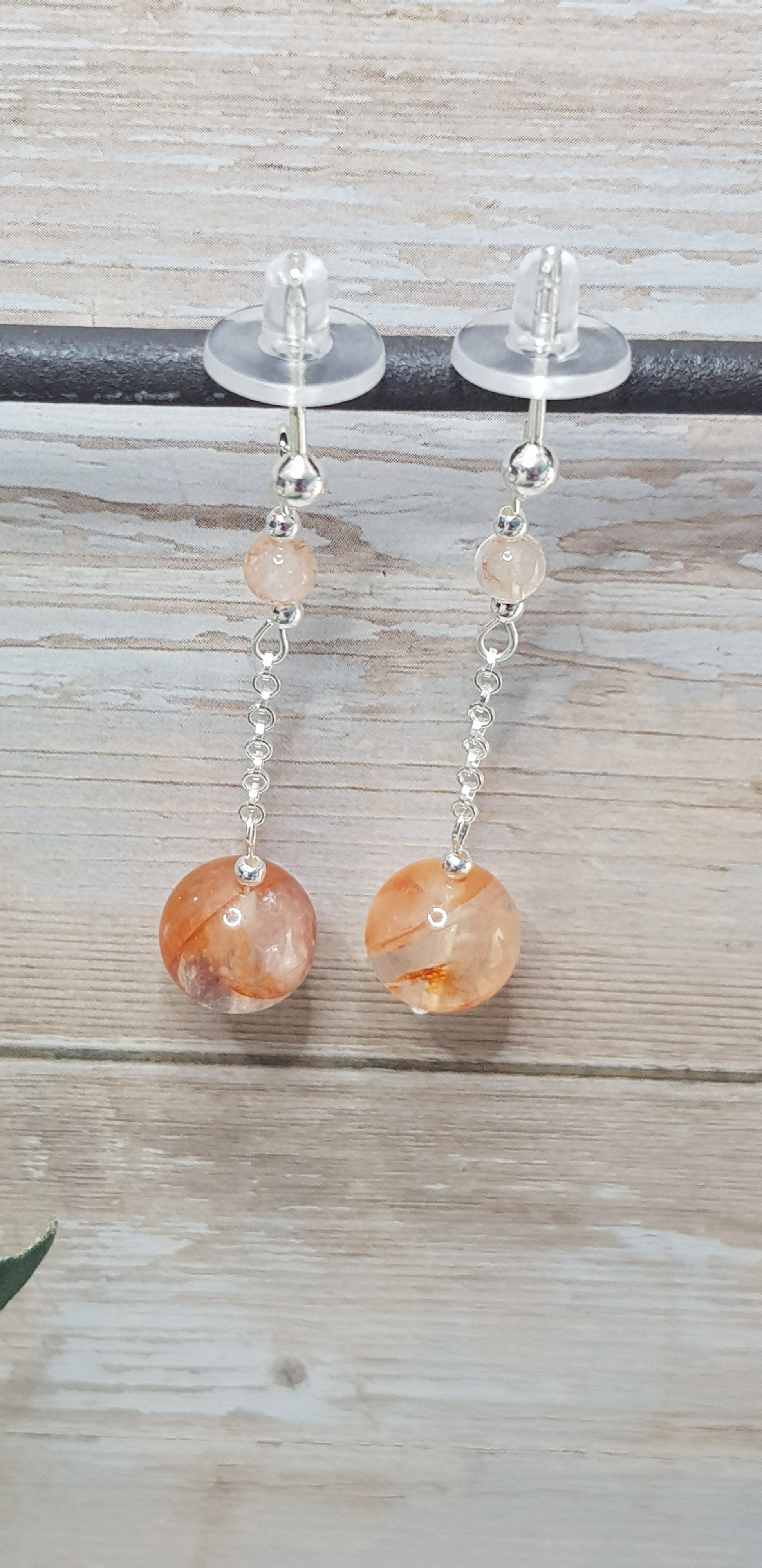 Boucles d'oreilles quartz hématoide rouge appelé aussi quartz de feu argent 925 composées d'une perle quartz hématoide rouge 10 mm, 2 crochets oreilles argent 925, 2 perles argent 925, 1bijou aile d’ange argent 925