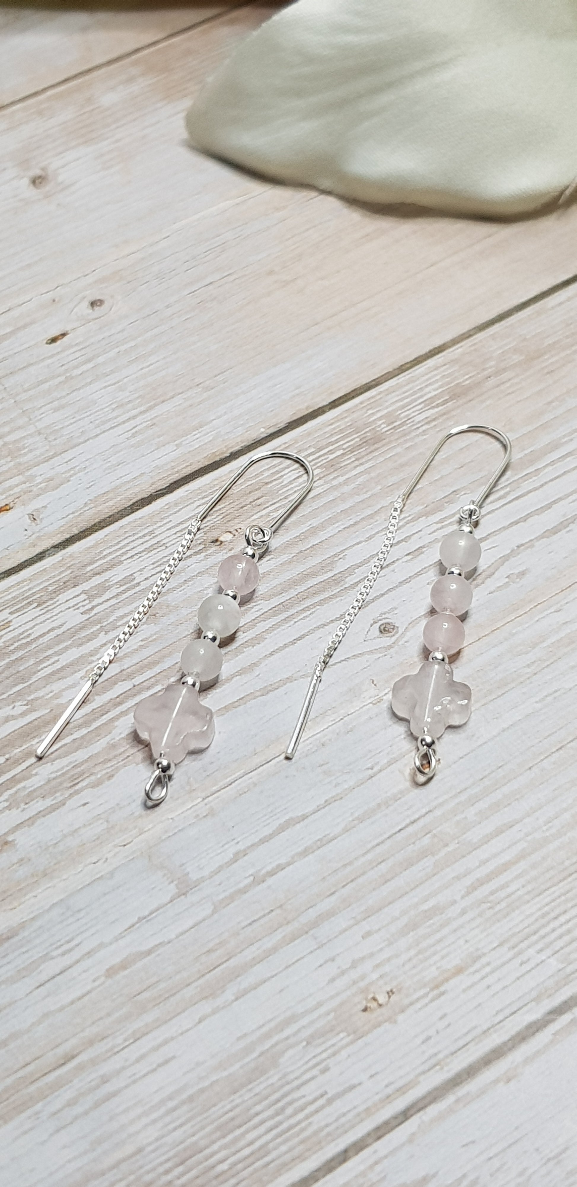 Boucles d'oreilles quartz rose argent 925 composées de 3 perles quartz rose 4 mm, 1 pierre quartz rose alhambra, 2 crochets oreilles argent 925, 5 perles argent 925,