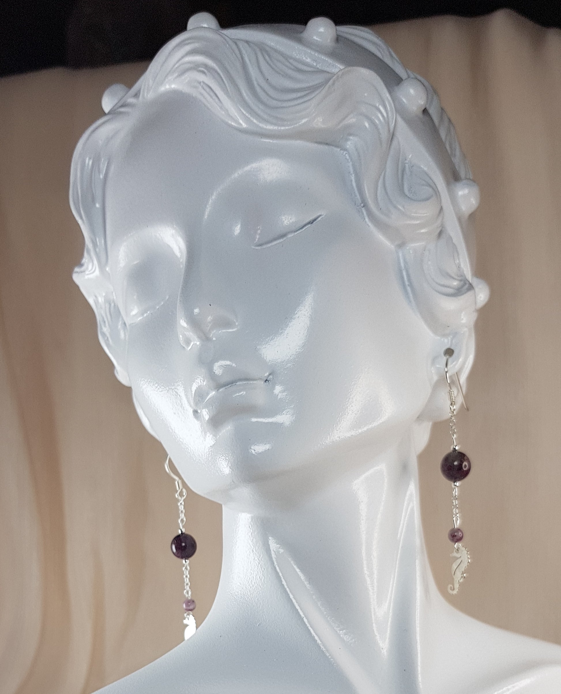 Boucles d'oreilles tourmaline rose argent 925 composées d'une perle tourmaline rose 8 mm, 2 crochets oreilles argent 925, 2 perles argent 925, 1bijou hippocampe argent 925