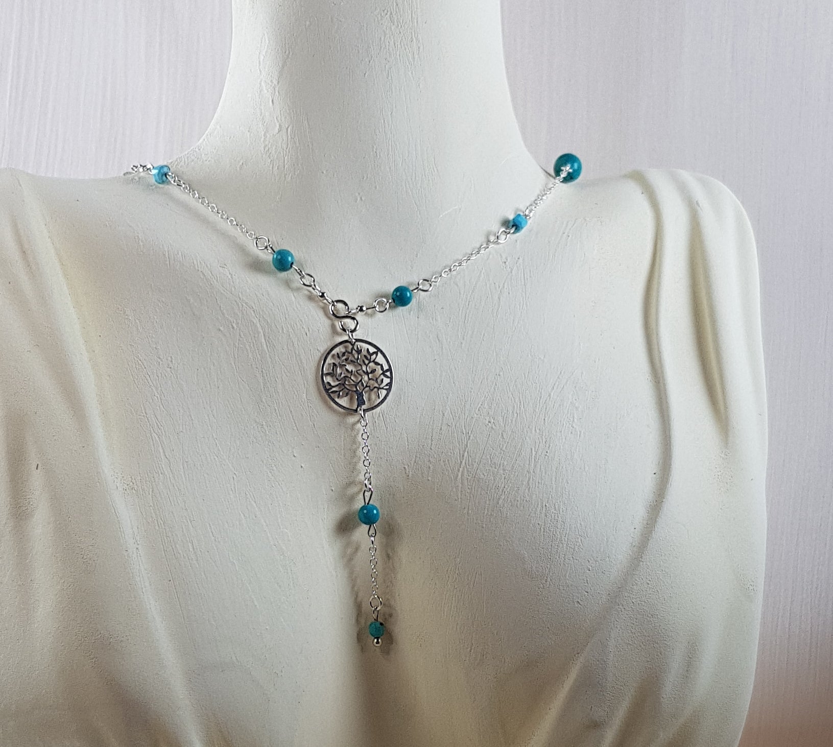 Chaine argent 925 turquoise + perles argent 925 + chaine argent 925 + anneau argent 925 + appret argent 925 arbre de vie. Tour de cou 45 cm
