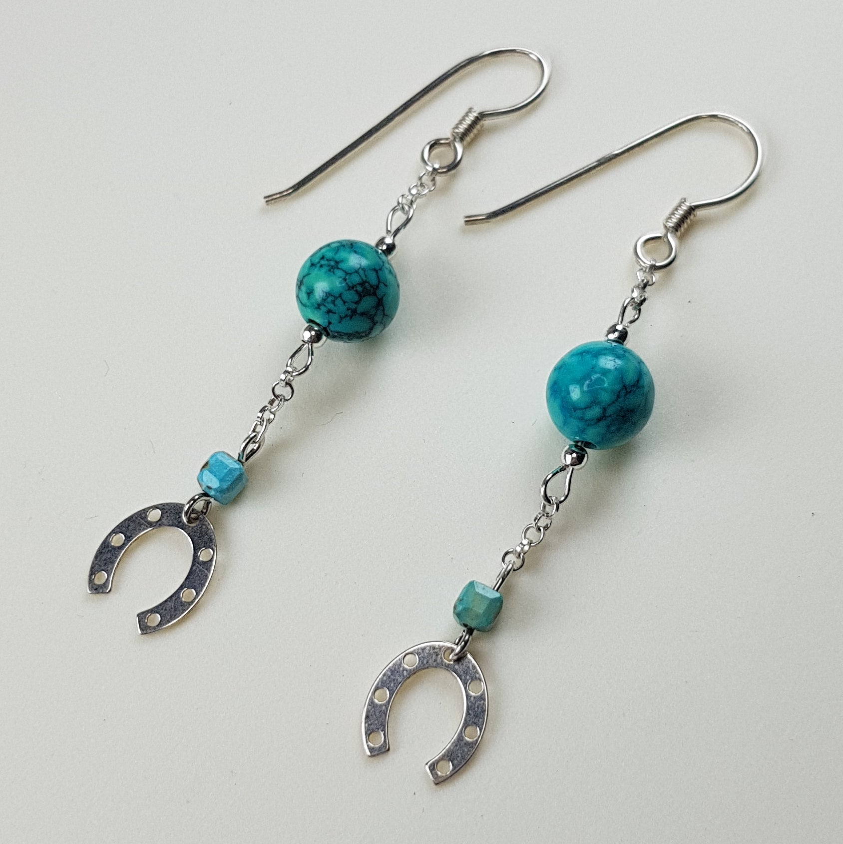 Boucles d'oreilles turquoise argent 925 composées d'une perle turquoise 8 mm, 2 crochets oreilles argent 925, 2 perles argent 925, 1bijou fer à cheval argent 925