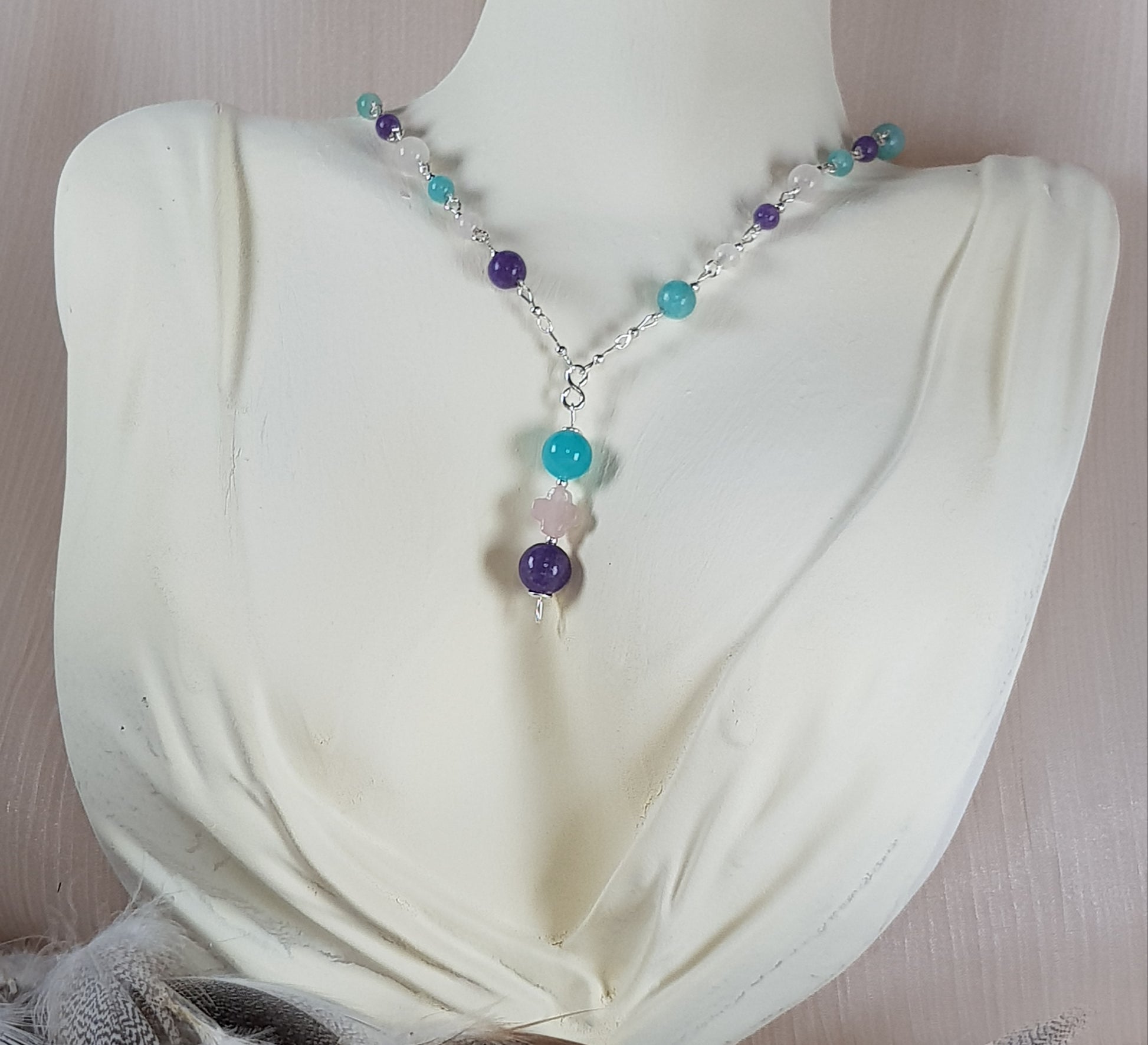 composé de pierres quartz rose, lépidolite, amazonite + perles argent 925 + chaine argent 925